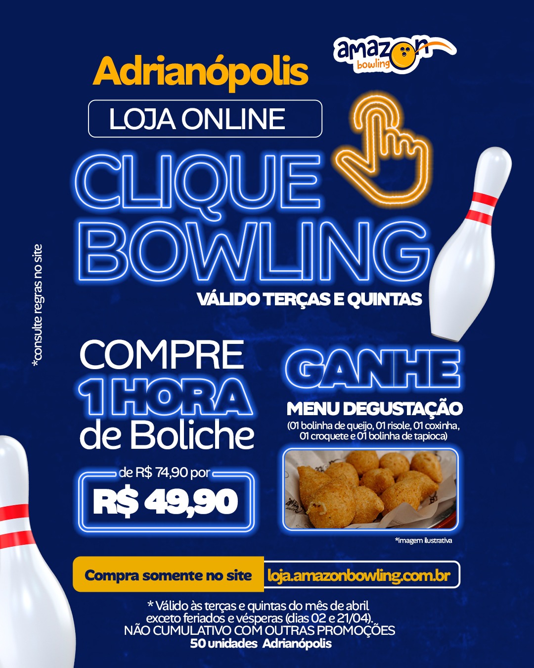 ADRIANÓPOLIS - CLIQUE BOWLING ABRIL: Compre 01 Hora de Boliche com desconto e GANHE 01 Menu Degustação de R$74,90 por apenas R$49,90 *Consulte as regras na descrição*
