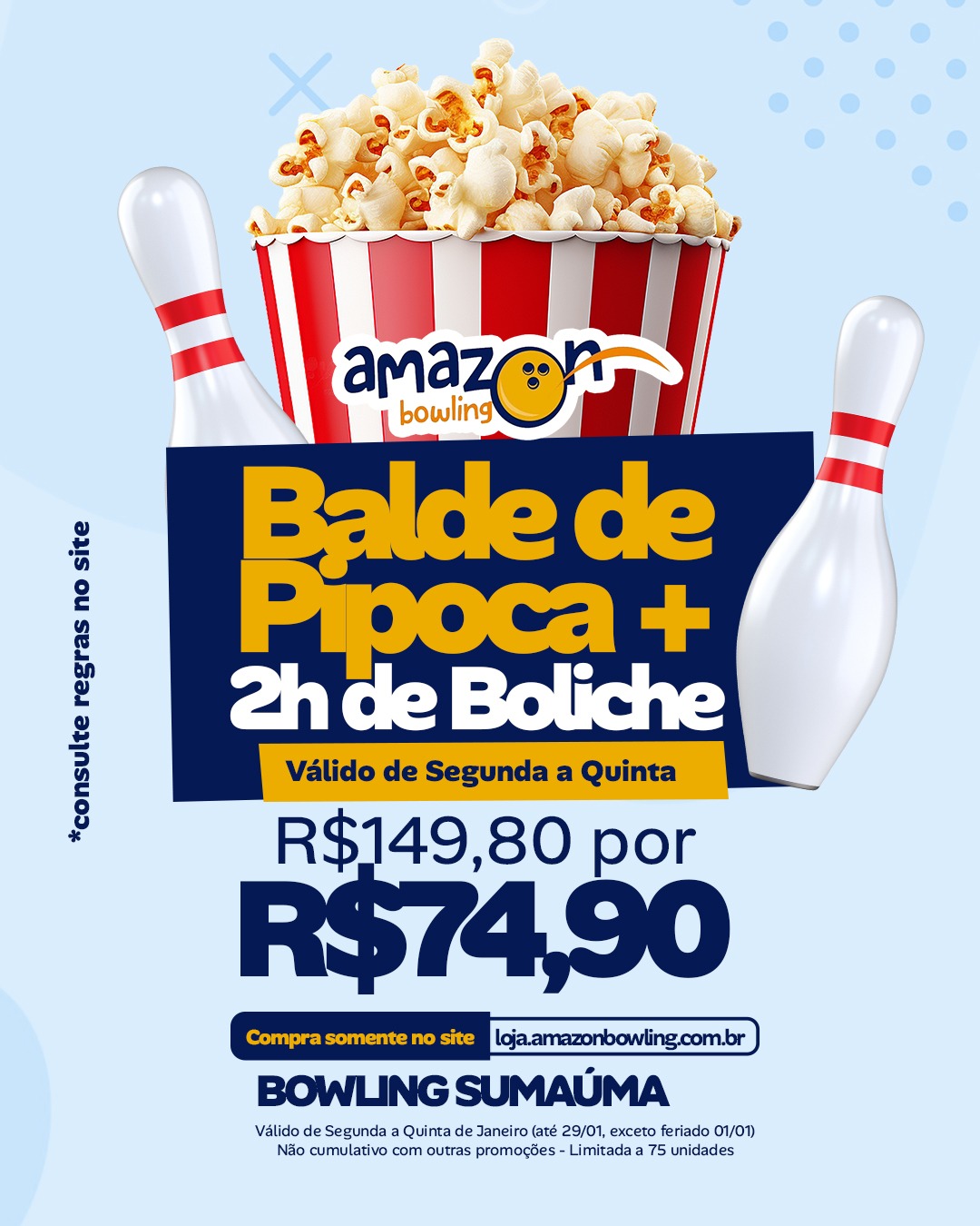- Promoção referente a hora promocional do boliche na unidade Sumaúma, onde cada pista de boliche comporta até 6 pessoas.